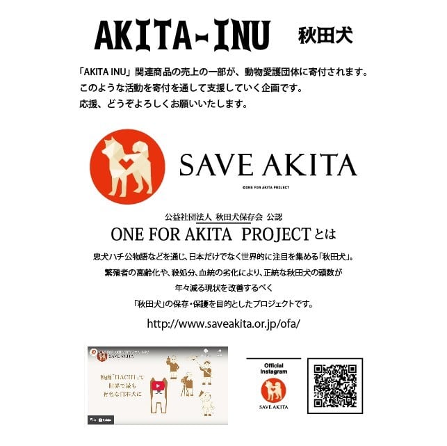「AKITA INU」関連商品の売上の一部が、動物愛護団体に寄付されます。